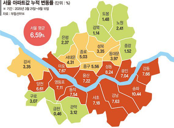 반면 금천구(0.5%), 강북구(1.1%), 도봉구(1.5%), 중랑구(1.5%) 등은 오름폭이 1% 안팎에 그쳐 평균에 크게 못 미쳤다. 은평구(2.4%), 노원구(2.4%) 등도 상승세가 미약했다. 6·27 대출 규제로 서울 외곽지역에 풍선효과가 나타날 것이라는 전망도 나왔지만 격차가 벌어지며 아파트값의 양극화가 심화되는 모습이다.