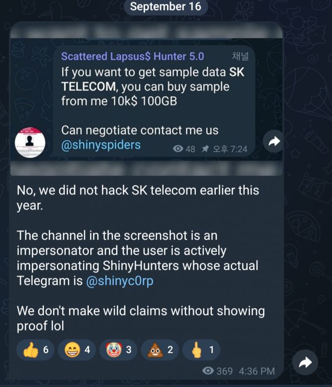 16일 스캐터드 랩서스$(Scattered Lapsus$)는 자신의 텔레그램(스캐터 랩서스$ 헌터스 4.0)에 "우리는 올 초 SKT를 해킹하지 않았다"며 "(해킹했다고 주장하는) 채널은 모방자"라고 밝혔다. 이어 "우리는 증거 없이 무분별한 주장을 하지 않는다"고 덧붙였다. 이 채널의 구독자는 5만3000명이다.