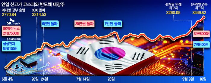 신현용 유안타증권 연구원은 “미국 오라클의 수주 잔고 급증으로 AI(인공지능) 인프라스트럭처 투자 빅사이클이 다시 주목받으며 반도체 업종 전반에 대한 이익 개선 기대감이 작용하고 있다”며 “반도체 이익 개선 기대감이 증시 상승세를 뒷받침하며 코스피가 신고가 랠리를 지속할 것”이라고 설명했다.