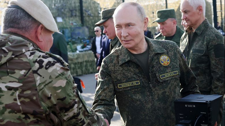 군복을 입고 훈련장을 찾은 푸틴 대통령은 안드레이 벨로우소프 국방장관의 브리핑을 듣고 각종 무기와 군사 장비를 시찰했습니다.