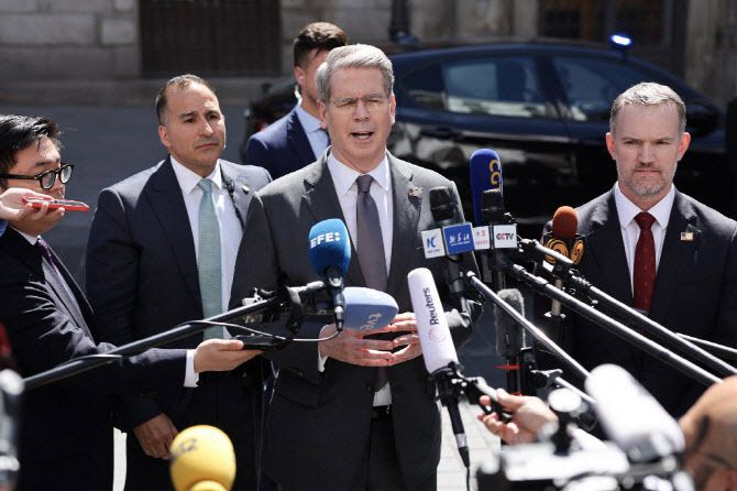 스콧 베선트(가운데) 미국 재무장관이 15일(현지시간) 스페인 마드리드에서 중국과 경제무역 회담을 마친 후 기자회견하고 있다. (사진=AFP)