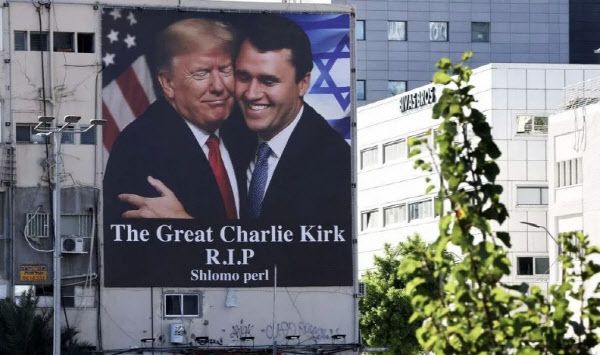 이스라엘 텔아비브의 건물 외벽에 지난 10일 피살된 미국 우익 활동가 찰리 커크를 추모하는 현수막이 걸려 있다.(사진=AFP)