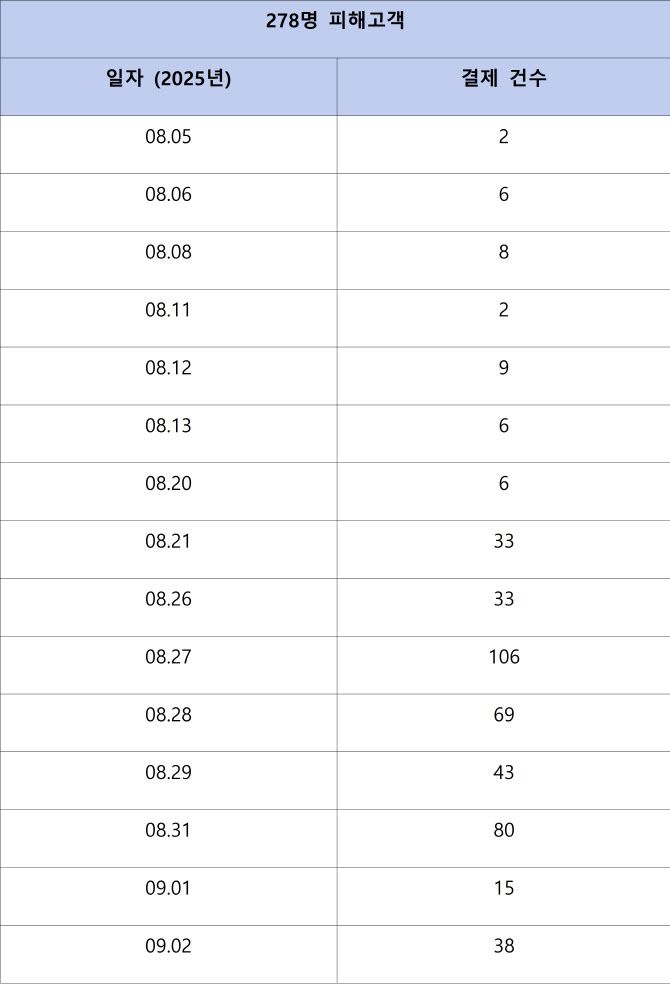 이후에도 두 자릿수 규모의 피해가 이어졌고, 경찰 통보 후인 9월 2~3일에도 109건이 추가로 발생했다.