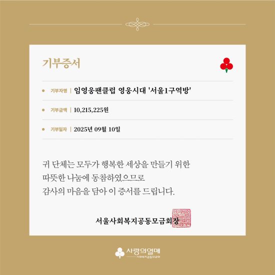 17일 서울 사회복지공동모금회(서울 사랑의열매, 회장 김재록)는 임영웅 팬클럽 '영웅시대 서울1구역'이 가수의 정규 2집 앨범 발매를 기념해 약 1천만 원을 기부했다고 밝혔다.