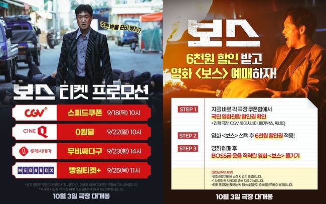 영화 '보스'가 CGV, 롯데시네마, 메가박스, 씨네Q, 극장 4사의 통 큰 티켓 프로모션 진행 확정과 더불어 정부 지원 국민 영화관람 할인권 이용으로 부담 없이 관람 가능한 점을 알리며 예비 관객들의 마음을 설레게 만든다. 먼저 9월 18일(목) 오전 10시 CGV ‘스피드쿠폰’의 오픈과 함께 대규모 티켓 프로모션의 시작을 알릴 예정이다. 특히 씨네Q에서 9월 22일(월) 오전 10시 오픈되는 ‘0원딜’, 롯데시네마에서 9월 23일(화) 오후 2시 오픈되는 ‘무비싸다구’, 메가박스 9월 25일(목) 오전 11시 오픈되는 ‘빵원티켓+’는 최대 할인 적용 시 무료 관람이 가능한 파격적인 프로모션으로, 선착순으로 소진되는 만큼 치열한 예매 경쟁이 이어질 것으로 예상된다. 여기에 6천원 영화 할인 혜택이 적용되는 정부 지원 영화관람 할인권 또한 사용할 수 있는 만큼 예매 열기를 더욱 뜨겁게 달굴 전망이다. 9월 8일(월)부터 2차 배포를 시작한 국민 영화관람 할인권은 CGV, 롯데시네마 , 메가박스, 씨네Q 극장에서 소진 전까지 선착순으로 적용 가능하여, 이번 추석 단 하나의 코미디 영화를 기대하는 관객들의 예매 욕구를 더할 것이다. 믿고 보는 탄탄한 배우진의 코믹 케미와 환상적인 연기 앙상블로 올 추석 폭발적인 기대를 모으고 있는 '보스'의 대규모 티켓 프로모션에 대한 자세한 내용은 각 극장별 홈페이지와 애플리케이션에서 확인할 수 있다.