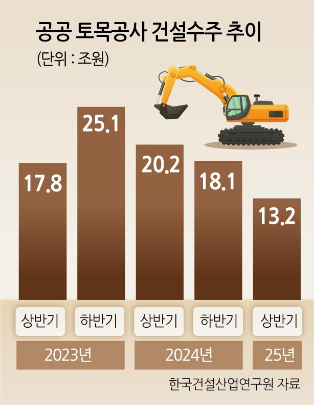 한국건설산업연구원 통계를 봐도 SOC 공사 위주인 공공 토목공사 수주액은 눈에 띄게 줄어들었다. 올해 1~6월 공공 토목공사 건설수주는 13조2000억원으로 전년 동기(20조2000억원) 대비 약 35% 감소했다. 반기별로 보면 지난 2023년 하반기 25조1000억원→2024년 상반기 20조2000억원→2024년 하반기 18조1000억원 등으로 계속해서 내림세를 보이고 있다.