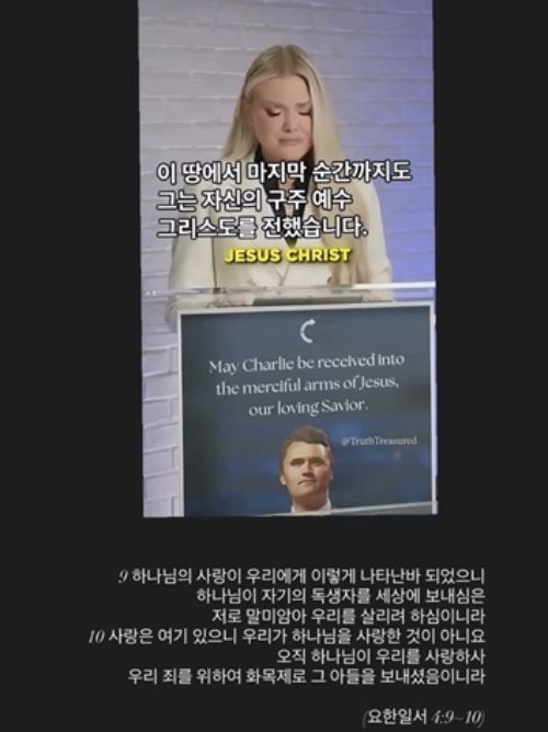 또 그가 게재한 영상에는 한 여성이 "찰리는 우리의 사랑스러운 구세주이신 예수님의 자비로운 품에 안길 수 있다"고 적힌 연단에 선 모습이 담겼다.
