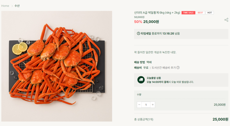 서울신문이 운영하는 '대한매일상회'에서는 동해에서 잡은 박달홍게를 집에서도 맛볼 수 있도록 판매하고 있다. 알이 꽉 찬 A급 박달홍게 구성은 여유로운 집밥 상차림에도, 소중한 이와의 특별한 만찬에도 잘 어울린다. 깊고 진한 게살과 고소한 내장은 마치 동해 바다를 식탁 위에 그대로 올려놓은 듯한 기분을 선사한다.