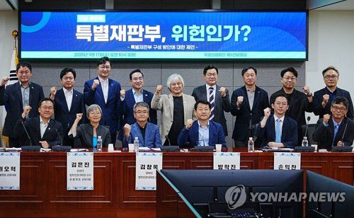 (서울=연합뉴스) 17일 서울 여의도 국회 의원회관에서 내란 사건 특별재판부 구성을 주제로 열린 긴급 공청회에서 시민단체 촛불행동 회원들과 참석자들이 기념촬영하고 있다.
