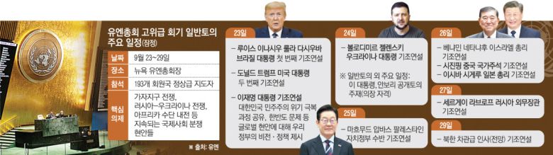 16일(현지시간) APㆍAFP 등 주요 통신과 유엔 등에 따르면 유엔 창설 80주년을 맞은 올해 고위급 회기(23∼29일)는 ‘분쟁의 그림자’ 속에서 개막될 예정이다. 193개 회원국 지도자들이 대표로 참석하는 이번 회기에는 각국 정상이나 총리, 장관급 인사가 차례로 연단에 오른다.
