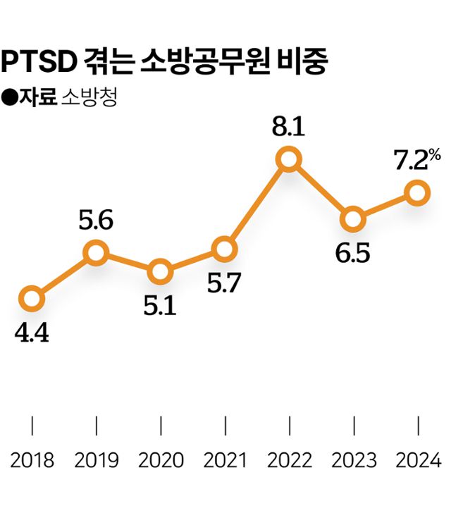 이들만의 일일까. 소방청의 ‘소방공무원 마음건강 설문조사 결과’를 보면 외상 후 스트레스 장애(PTSD)를 겪은 소방관 비중은 지난해 100명 중 7명이 넘는다(7.2%). 실명을 내놓고 하는 설문에서 자신을 그대로 드러내기는 쉽지 않다. 실제로는 이보다 훨씬 많을 것이다.