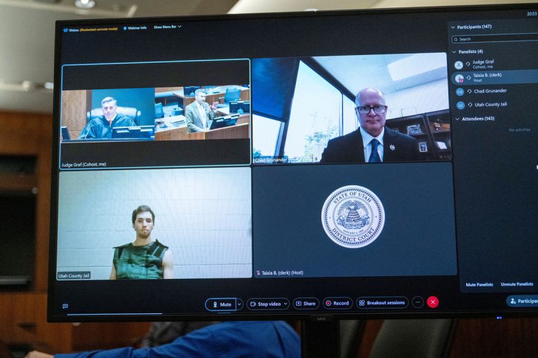 16일 유타주 제4지구 법원에서 열린 첫 공판에 찰리 커크 피살 사건의 용의자인 타일러 로빈슨(왼쪽 아래)이 화상으로 출석했다. 로이터연합뉴스 |