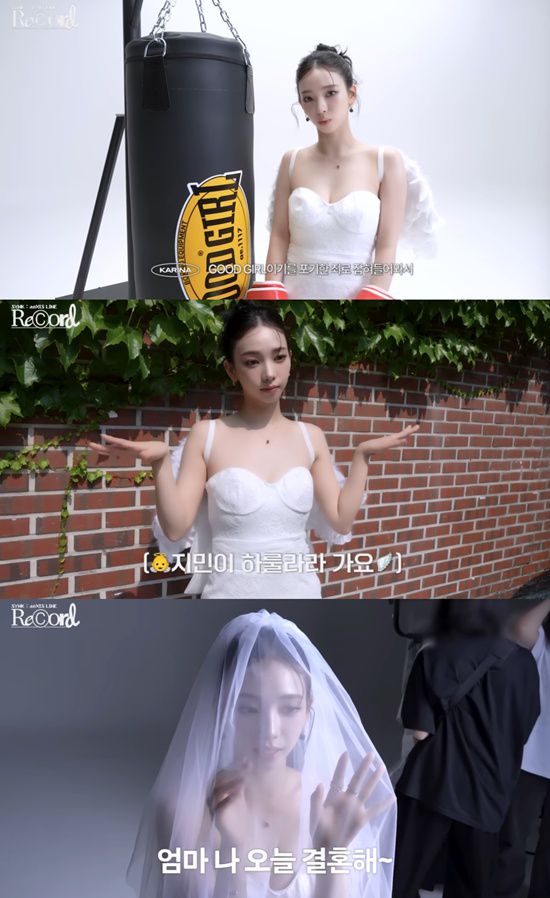 이어 면사포를 쓰고도 촬영을 진행했다. 카리나는 웨딩드레스 입은 모습을 간직하려는 듯 "엄마한테 보여줘야겠다"며 사진을 찍었다. 그러면서 그는 "엄마, 나 오늘 결혼해. 나랑"이라고 너스레를 떨어 웃음을 자아냈다.