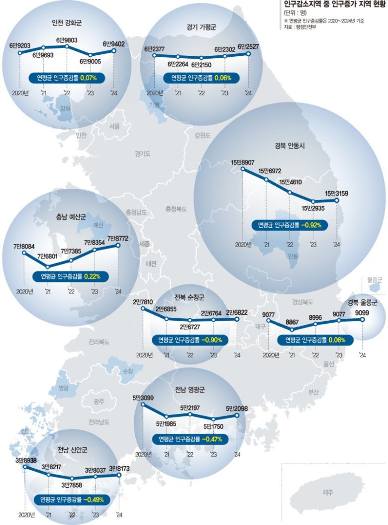 소멸위험지역인 신안군과 순창군도 인구가 늘어나는 성과를 봤다. 신안군은 1년 0.36%, 2년 0.42% 증가했다. 4년 기준으로는 0.49% 감소로 집계됐다. 순창군은 1년 0.22%, 2년 0.18% 증가했지만 4년 기준은 0.90% 감소다. 두 지역은 2022년을 전후로 인구수가 바닥까지 갔다가 꾸준한 인구증가 정책으로 상승 반전했다. 인구 감소로 홍역을 앓던 강화군, 영광군, 안동시는 지난해 처음으로 증가로 전환한 지역이다.