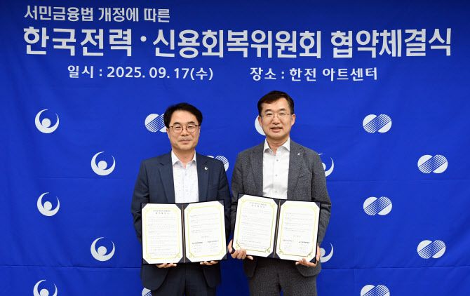 한전은 17일 서울 양재동 한전아트센터에서 신복위와 함께 전기요금 채무조정 시행을 위한 업무협약을 체결했다. 양 기관은 서민의 금융생활 지원에 관한 법률(서민금융법) 제75조 개정안 시행(9월19일)에 맞춰 개인 채무조정 대상자의 연체 전기요금을 금융 채무와 통합해 조정하는 제도를 본격 추진하게 된다.