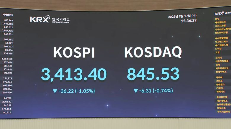 코스피는 외국인과 기관의 동반 순매도 속에 1.05% 내린 3,413.40으로 장을 마쳤습니다.
