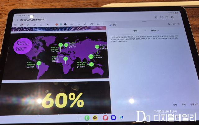 개선된 S펜은 AI 기능과 함께 쓸 때 더욱 빛을 발했다. 이를테면 가로모드에서 분할 화면으로 왼쪽엔 PDF나 외신을 띄운 채 갤럭시 AI로 페이지를 번역하는 한편, 오른쪽 메모 앱에다가 S펜으로 필기할 수 있어 편리했다. 양쪽 화면 분할의 경우 11인치임에도 불편하지 않았다. 3분할부터는 답답했다.