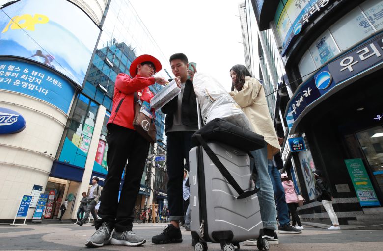 서울 명동 거리에서 중국인 관광객들이 관광 안내를 받고 있다. 연합뉴스