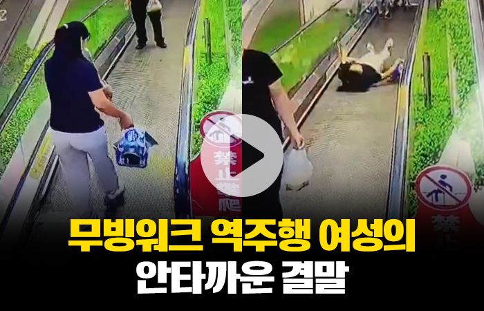 그렇게 막무가내로 전진하던 이 여성이 갑자기 균형을 잃고 무빙워크 위에서 그대로 넘어졌습니다.