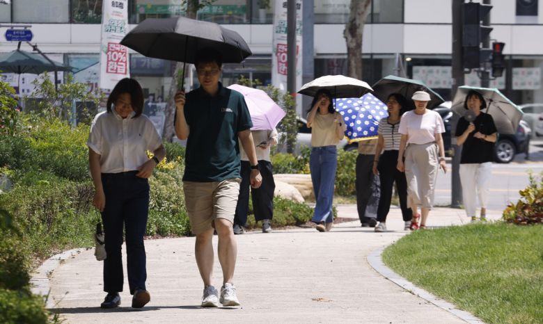 서울 낮 최고기온이 37도를 기록하는 등 전국 대부분 지역에 폭염이 기승을 부린 29일 서울 송파구 석촌호수 인근에서 양산을 쓴 시민들이 더위를 피해 발걸음을 옮기고 있다. 조현호 기자 hyunho@ |