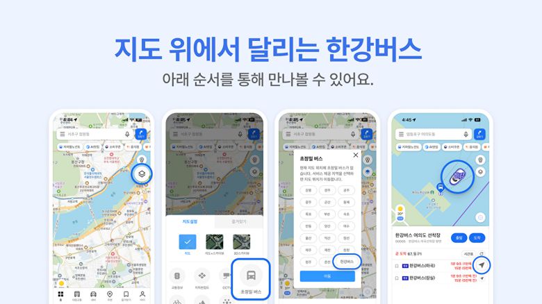 초정밀 한강버스는 실시간 위치 정보를 이용해 강 위에서 실시간으로 이동하는 버스 위치를 직관적으로 보여준다. 한강버스는 국내 최초로 도입되는 수상 대중교통수단으로, 여의도·압구정·잠실 등 7개 선착장에서 하루 14회 운항한다. 이번 서비스 도입을 위해 카카오는 약 1년간 서울시 미래한강본부, 서울시 교통정보 시스템(TOPIS)과 협력해 실시간 데이터 연계 협의와 테스트를 진행했다고 밝혔다.