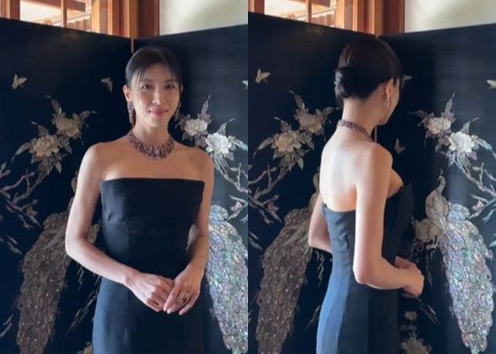 18일 하지원은 자신의 인스타그램에 드레스를 입고 자개로 장식된 병풍 앞에서 포즈를 취하고 있는 짧은 영상을 게시했다.