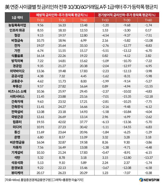 반면, 경기방어적 금리인하 하에서는 유동성 효과에 민감하게 반응하는 비필수소비재와 기술주 외에도 에너지와 통신 등 방어적 성격이 강한 섹터가 강세를 보였다.