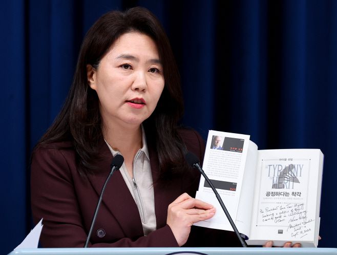 강유정 대통령실 대변인이 18일 서울 용산 대통령실에서 마이클 샌델 교수가 이재명 대통령에게 선물한 책을 펼쳐보이고 있다. /연합뉴스 |