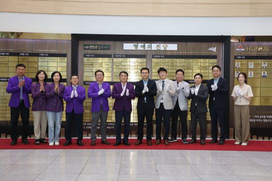 ​​▲㈜탑선 참석자들이 신안군청 명예의 전당에서 명패를 게시하며 기념 촬영을 하고 있다. ⓒ신안군