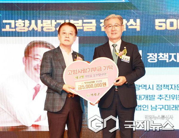 (의령=국제뉴스) 황재윤 기자 = 의령군은 18일, 재부의령군향우회 부회장을 맡고 있는 진남일 전 부산시의원이 지난 13일 열린 재부의령군향우회 창립 70주년 정기총회에서 고향사랑기부금 500만 원을 기부했다고 밝혔다.