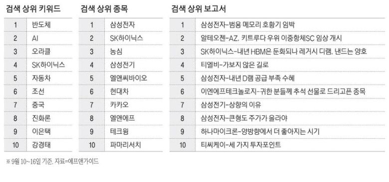 지난 일주일 동안 국내 투자자들의 최대 관심사는 반도체였다. 코스피가 16일까지 5거래일 연속 사상 최고치를 경신한 가운데 국내 시가총액 1·2위인 삼성전자와 SK하이닉스에 대한 관심이 높았다. 삼성전자가 범용 메모리 호황기에 임박했다는 것에 대한 리포트도 투자자들의 열독률이 높았다.