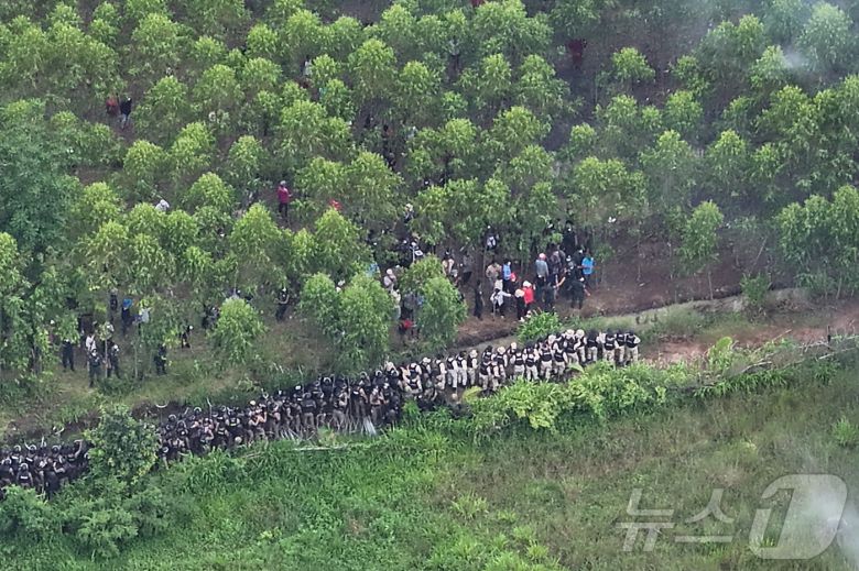 17일(현지시간) 캄보디아의 국경 분쟁 지역에 위치한 마을에서 태국 군인들과 경찰들이 캄보디아 시위대와 대치하고 있다. 2025.09.17. ⓒ 로이터=뉴스1 ⓒ News1 윤다정 기자 |