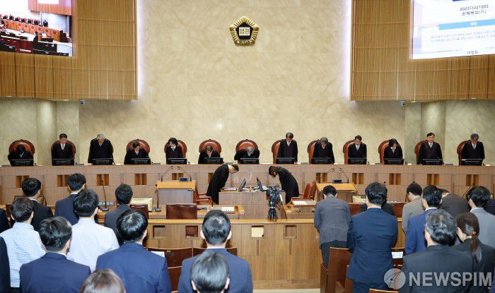 [서울=뉴스핌] 정일구 기자 = 조희대 대법원장을 비롯한 대법관들이 18일 오후 서울 서초구 대법원 대법정에서 열린 전원합의체 선고에 착석하고 있다. 2025.09.18 mironj19@newspim.com |