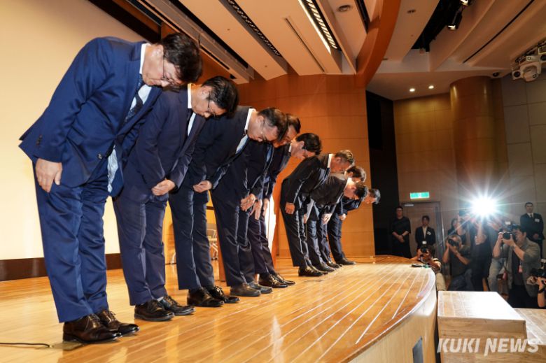 조좌진 롯데카드 대표이사 등 관계자들이 18일 서울 중구 부영태평빌딩에서 대규모 해킹 사고로 인한 고객 정보 유출사태에 대해 사과하고 있다. 유희태 기자 |