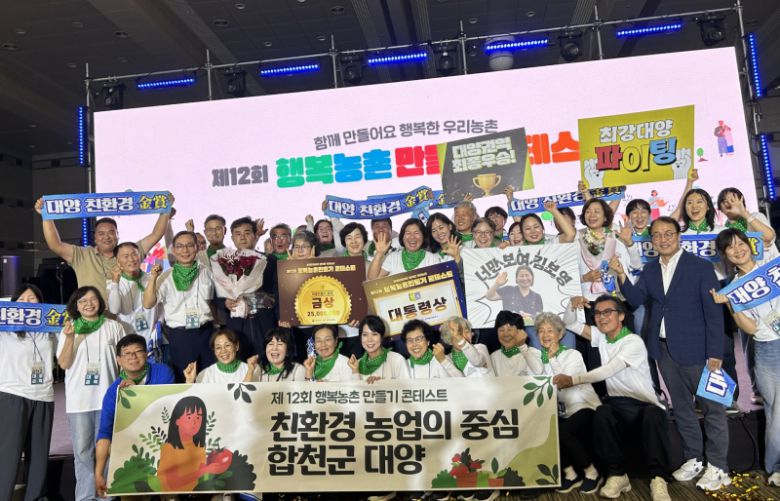 합천군(군수 김윤철)은 17일 과천 한국마사회 럭키빌에서 열린 제12회 행복농촌만들기 콘테스트 본선 ‘마을만들기 분야’에서 대양권역이 대통령상과 함께 마을현판, 시상금 2500만원을 수상했다. 또한 합천군은 농림축산식품부장관상과 시상금 750만원을 받았다.