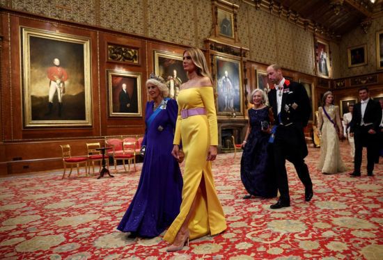 멜라니아, 영국 만찬서 '노란 드레스' 화제…외신 "트럼프 메시지 반영"