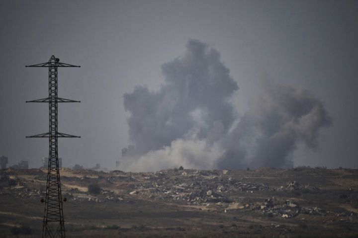 [AP/뉴시스] 18일(현지 시간) 이스라엘 남부에서 바라본 가자지구에 이스라엘군 공습으로 연기가 피어오르고 있다. 2025.09.18.