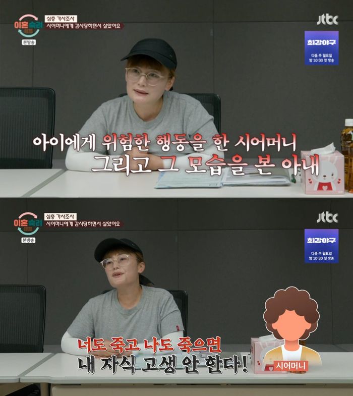 또한 아내는 “2021년에 아이가 4살이었다. 쓰레기 버리고 집에 들어오니까 시어머니가 끈을 아이와 자신의 목에 칭칭 감고 당겼다. 시어머니가 ‘우리 아들 50살이 다 돼가는데 너 언제 다 키우냐. 너도 죽고 나도 죽으면 내 자식 고생 안 한다’라고 했다”고 폭로했다.