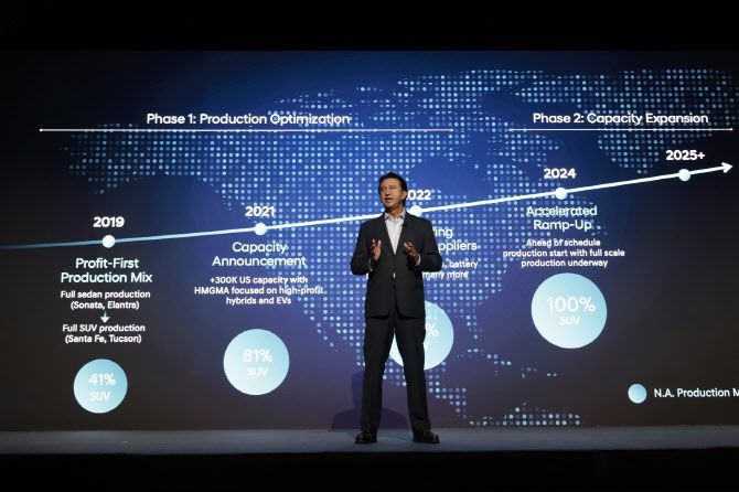 현대차그룹은 미국 조지아주에 설립한 ‘현대자동차그룹 메타플랜트 아메리카(HMGMA)’를 본격 가동해 생산능력을 현재 연 30만 대에서 2028년까지 50만 대로 확대할 계획이다. 무뇨스 사장은 “최근 한국 노조와 합의안을 도출해 한국 내 생산은 줄지 않을 것”이라며 “글로벌 성장 전략에 맞춰 오히려 역할이 강화된다”고 말했다. 그는 “이번 전략은 단순한 이전(transfer)이 아니라 성장(growth) 전략”이라며 “전체적으로 30%, 제네시스 브랜드는 50% 성장을 목표로 한다”고 밝혔다.
