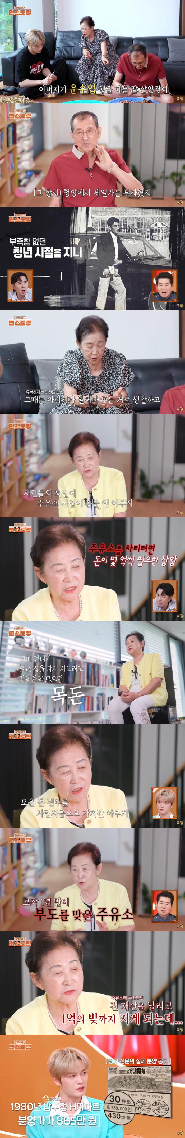 어머니는 "낡은 집을 다시 지으려고 내가 저축을 해놨는데, 그걸 다 달라고 하더라. 그냥 다 줬는데, 1년 후 주유소가 부도를 맞았다"며 "몇 억 들어간 전 재산을 날리고, 각자 1억 씩 빚을 떠안고 나왔다"고 말해 충격을 안겼다. 1980년 당시 압구정 현대 아파트 분양가가 865만원이었다고.
