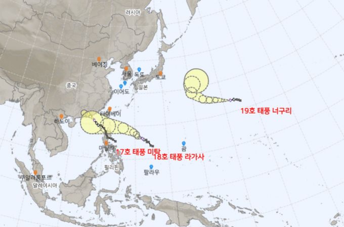 19일 기상청에 따르면 지난 18일 낮 17호 태풍 미탁이 발생한데 이어 이날밤 18호 태풍 라가사(Ragasa)와 19호 태풍 너구리(Neoguri)가 모습을 드러냈다. 이는 37·38·39호 열대저압부가 순번 그대로 17·18·19호 태풍으로 발달을 완료한 것이다.