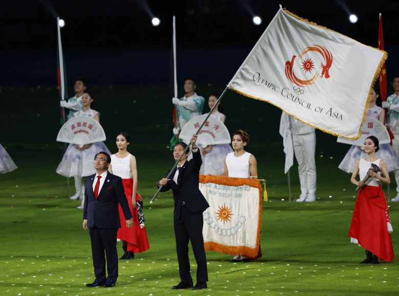 2023년 10월 중국 항저우 올림픽스포츠센터 스타디움에서 열린 2022 항저우 아시안게임 폐회식에서 차기 개최지인 일본 나고야 관계자에게 아시아 올림픽 평의회 깃발이 전달되고 있다. 사진=뉴시스