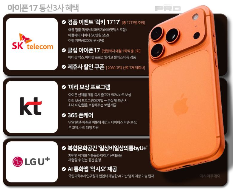 아이폰 신제품 구매 고객을 위한 T멤버십 혜택 '클럽 아이폰17'도 마련했다. 연말까지 매월 1회씩 총 3회에 걸쳐 래플 이벤트를 실시한다. 에어팟 맥스, 에어팟 프로2, 엘라고 셀피스틱 등 경품을 제공한다. 2030 고객들이 선호하는 7개 제휴사를 선정해 제휴사별 1회 이용이 가능한 할인 및 쿠폰 혜택도 제공한다.