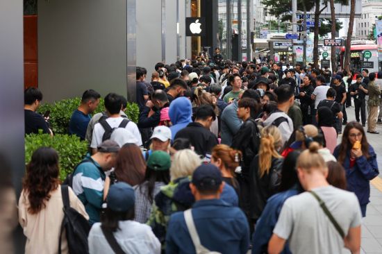 19일 오전 7시30분 찾은 서울 중구 명동에 위치한 애플스토어. 이날 아이폰 17 시리즈와 아이폰 에어의 출시일을 맞아 이른 아침부터 구매를 위한 줄이 늘어서 있었다. 아이폰 17 시리즈(아이폰 17·17 프로·17 프로 맥스, 아이폰 에어)는 이날 우리나라를 포함한 1차 출시국에서 동시에 출시된다. 우리나라는 지난해 아이폰 16 시리즈부터 1차 출시국에 포함됐는데, 이 영향으로 아이폰을 일찍 만나보려는 외국인 고객들도 대기줄에 섰다. 이윽고 아침 8시가 되자 직원들이 카운트다운을 거쳐 구매 고객들을 환영했다. 현장 관계자에 따르면 올해 아이폰 출시일에 애플스토어를 찾은 고객의 수는 지난해보다 늘었다.