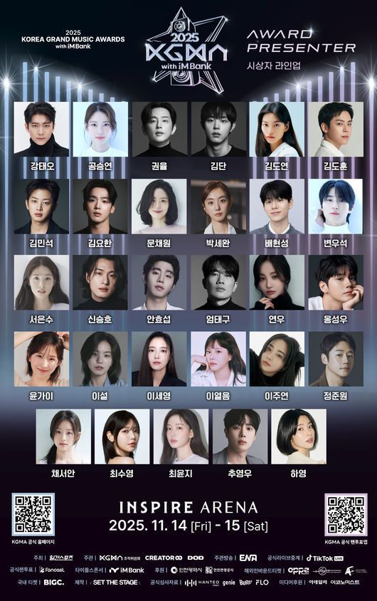 19일 KGMA 조직위원회는 오는 11월 14일과 15일 인천광역시 중구 운서동 인스파이어 아레나에서 개최되는 ‘2025 코리아 그랜드 뮤직 어워즈 with iMBank’(2025 KGMA)의 시상자로 강태오, 공승연, 권율, 김단, 김도연, 김도훈, 김민석, 김요한, 문채원, 박세완, 배현성, 변우석, 서은수, 신승호, 안효섭, 엄태구, 연우, 옹성우, 윤가이, 이설, 이세영, 이열음, 이주연, 정준원, 채서안, 최수영, 최윤지, 추영우, 하영(가나다순) 등이 참여한다고 공식 발표했다.