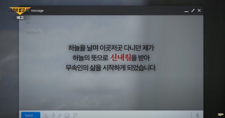 14년 차 베테랑 승무원이었던 정혜원(가명) 씨가 직원 2000여 명에게 퇴사를 앞두고 작별 인사를 건넸는데, 신내림을 받아 무속인이 됐다는 내용이었다. 그녀는 신당의 이름과 자신의 신명이 적힌 명함까지 공개했다.