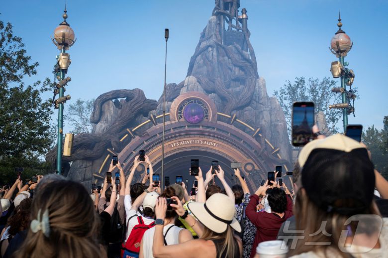 미국 플로리다주 올랜도에 새로 생긴 유니버설 스튜디오의 역대 최대 규모 테마파크 '에픽 유니버설'에서 사람들이 사진을 찍고 있다. 2025.05.21 ⓒ 로이터=뉴스1 ⓒ News1 정지윤 기자