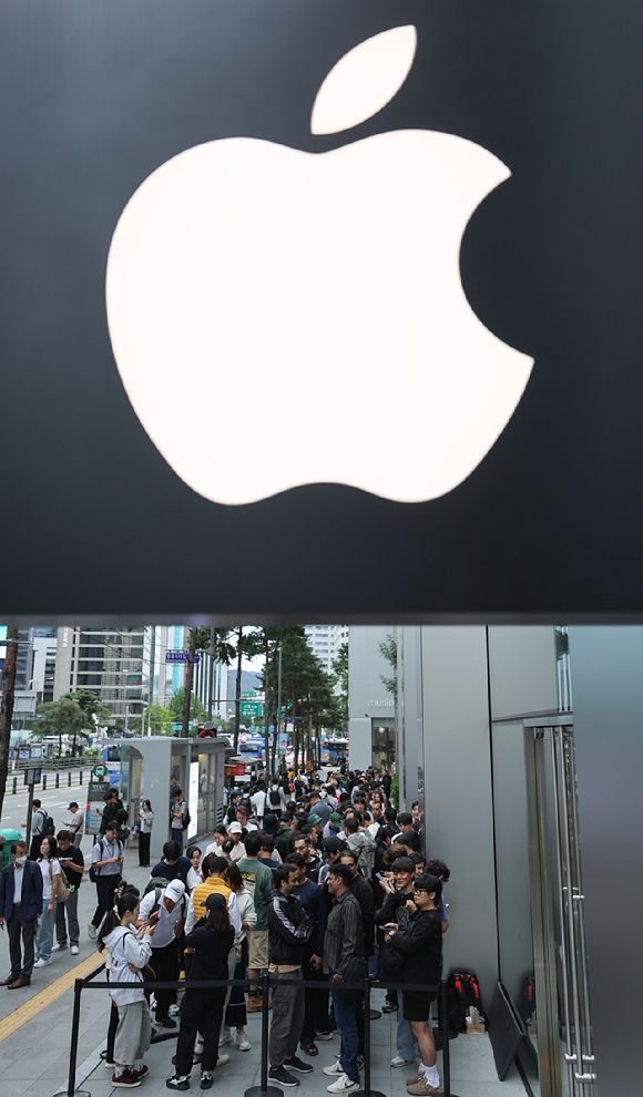 19일 오전 서울 중구 애플스토어 명동 앞에서 '아이폰17 시리즈' 판매를 기다리는 오픈런 인파들이 줄을 서 있다. [사진=연합뉴스]