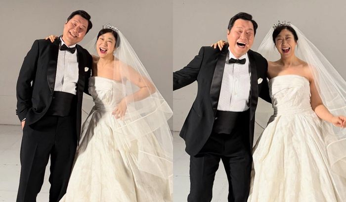 공개된 사진에는 MBC 새 금토드라마 ‘달까지 가자’에 함께 출연하는 라미란과 윤경호가 턱시도와 웨딩드레스를 입고 웨딩촬영 연기에 나선 모습이 담겼다.
