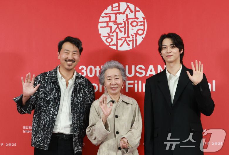 앤드루 안 감독(왼쪽부터)과 배우 윤여정, 한기찬이 19일 오후 부산광역시 해운대구 영화의전당에서 열린 '제30회 부산국제영화제(BIFF)' '결혼 피로연' 기자간담회에 참석해 포즈를 취하고 있다. 2025.9.19/뉴스1 ⓒ News1 권현진 기자